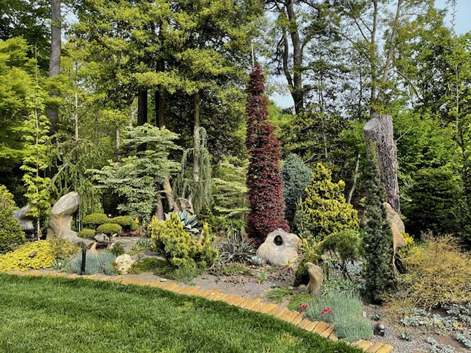 Water basin surrounded by Japanese Painted Ferns & Ligularia (Farfugium japonicum); background: thrashing stone and variegated Lady Palm.